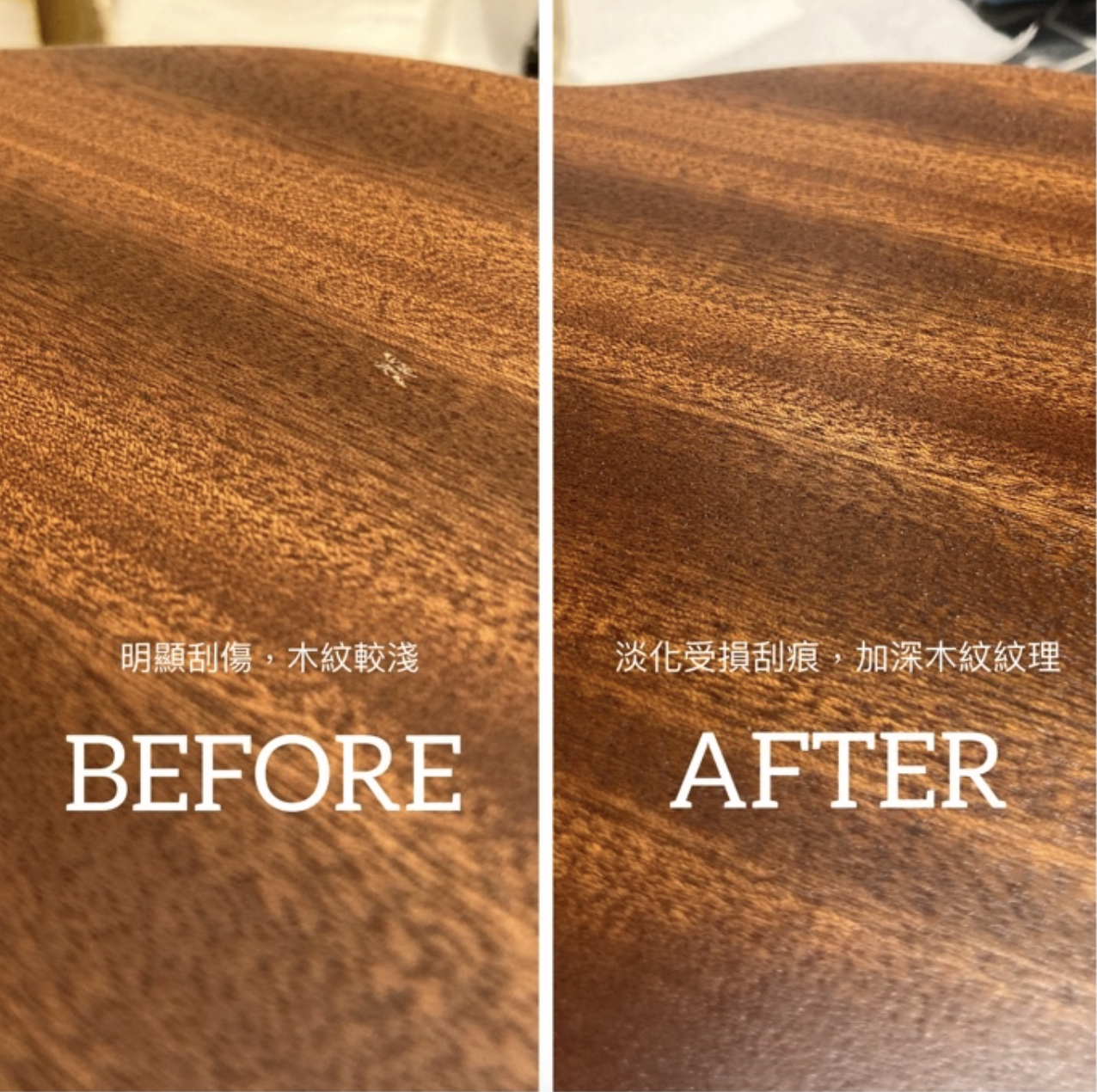 所以!當你使用「天然蜂蠟護木油」後,輕輕推勻並靜置等候吸收滋潤,再拿乾淨的布擦拭多餘的護木油,就能感受到前後的差異!