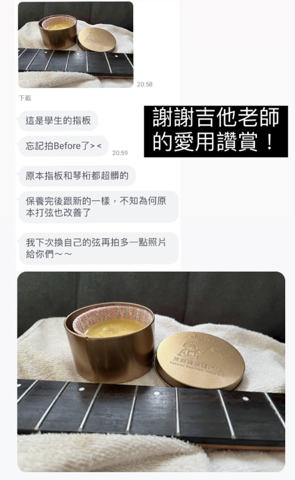 產品本身可以使用於上漆或未上漆的原木製品、竹藤器具,皮革製品,我們自己會很常使用在吉他指板的保養上!針對您寶貴的樂器提供最頂級的保養產品!打開包裝就能聞到淡淡的天然蜂蠟和亞麻仁油味道。純天然台灣手工製作,不含任何額外添加物、香精、人工化學物,安全無毒。