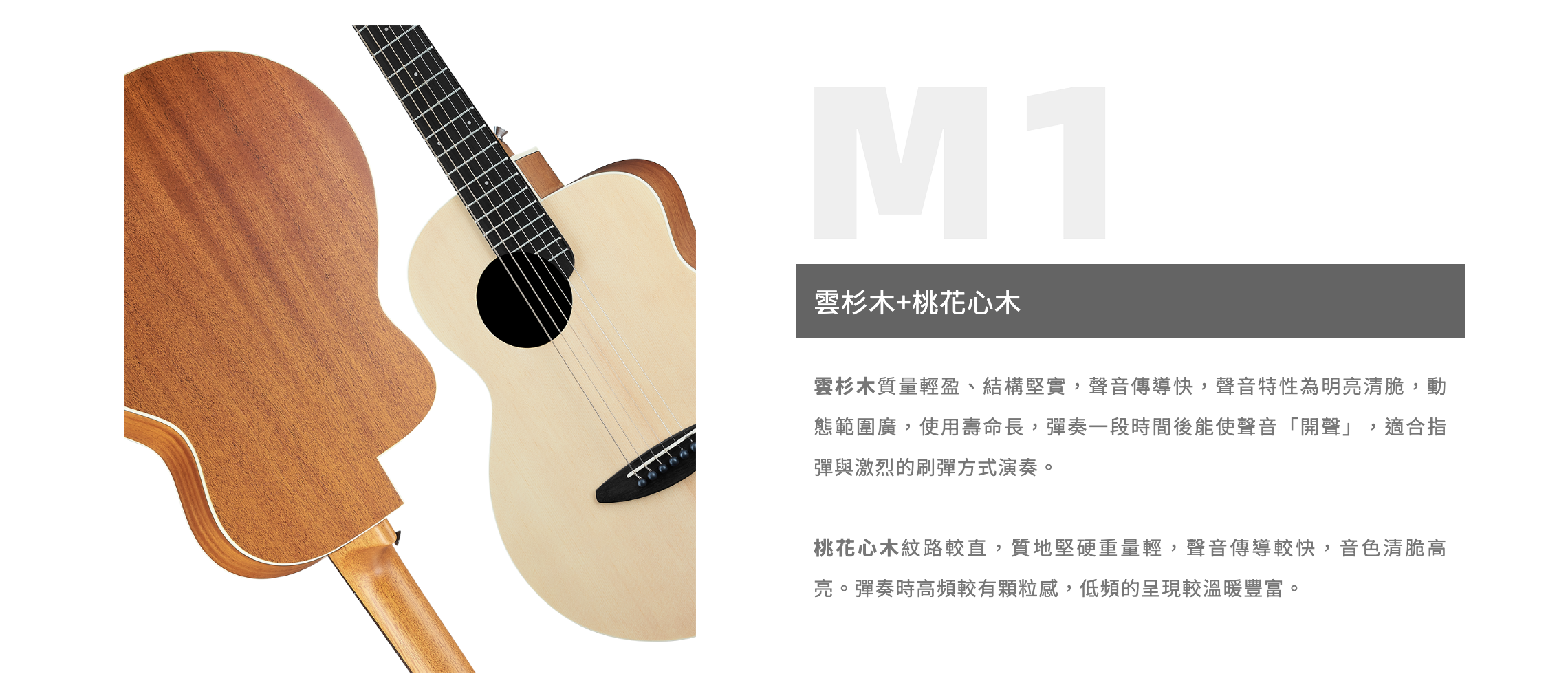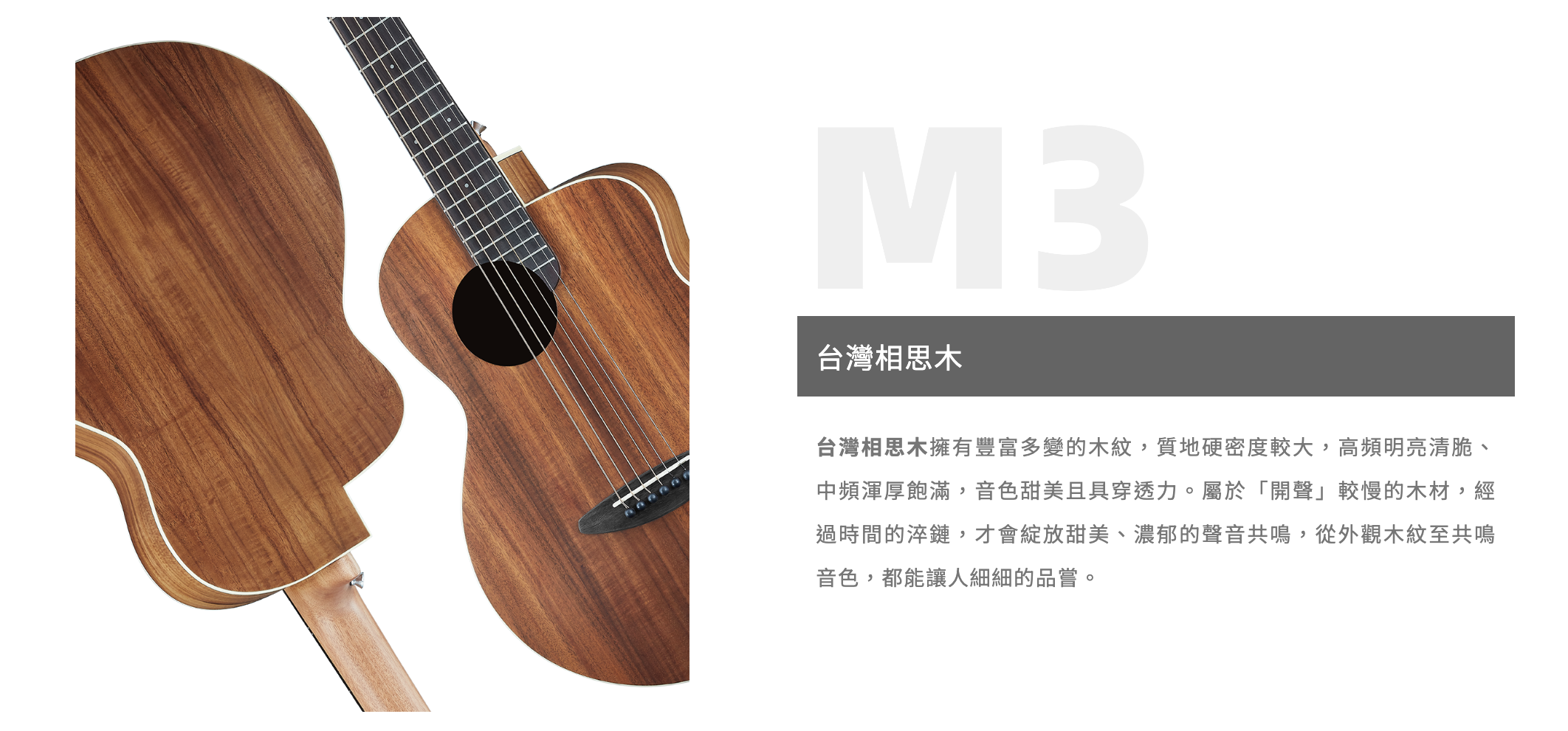 使用配置為合板相思木面板,搭配合板相思木背、側板,木紋獨特美麗是一大特色。相思木彈奏的音色,中頻溫暖而厚實,高頻清脆且明亮。