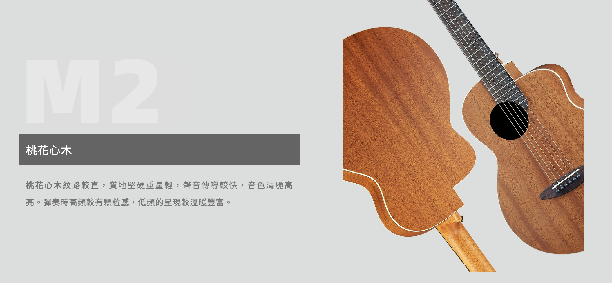 桃花心木,紋路較直,質地堅硬重量輕,聲音傳導較快,音色清脆高亮。彈奏時高頻較有顆粒感,低頻的呈現較溫暖豐富。