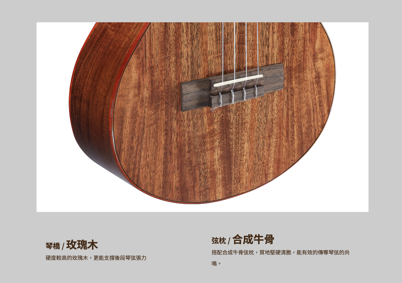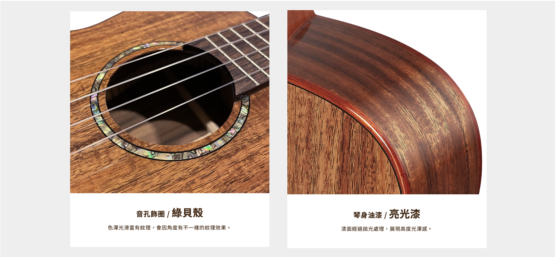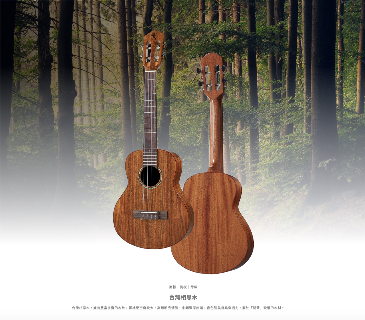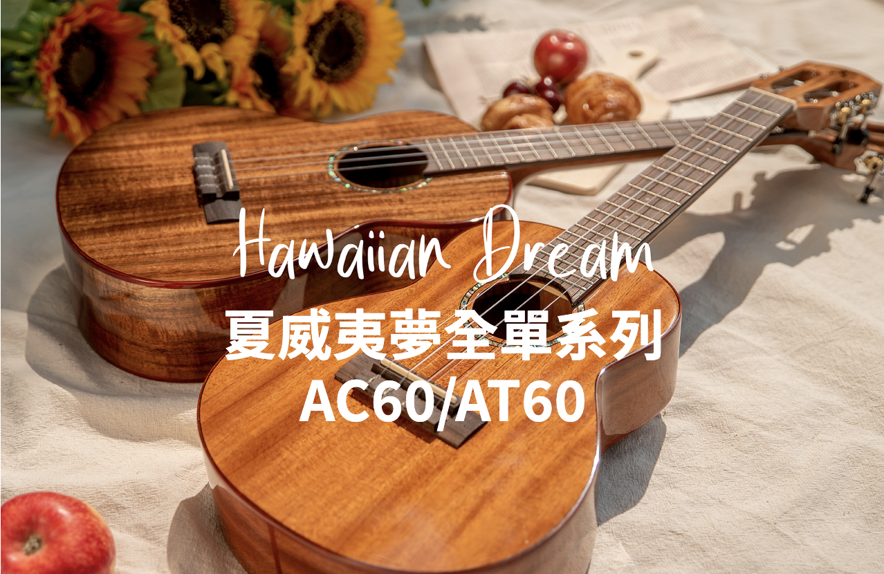 夏威夷夢全單系列 AC60 / AT60 台灣相思木擁有豐富多變的木紋,質地硬密度較大,高頻明亮清脆、中頻渾厚飽滿,音色甜美且具穿透力。屬於「開聲」較慢的木材。