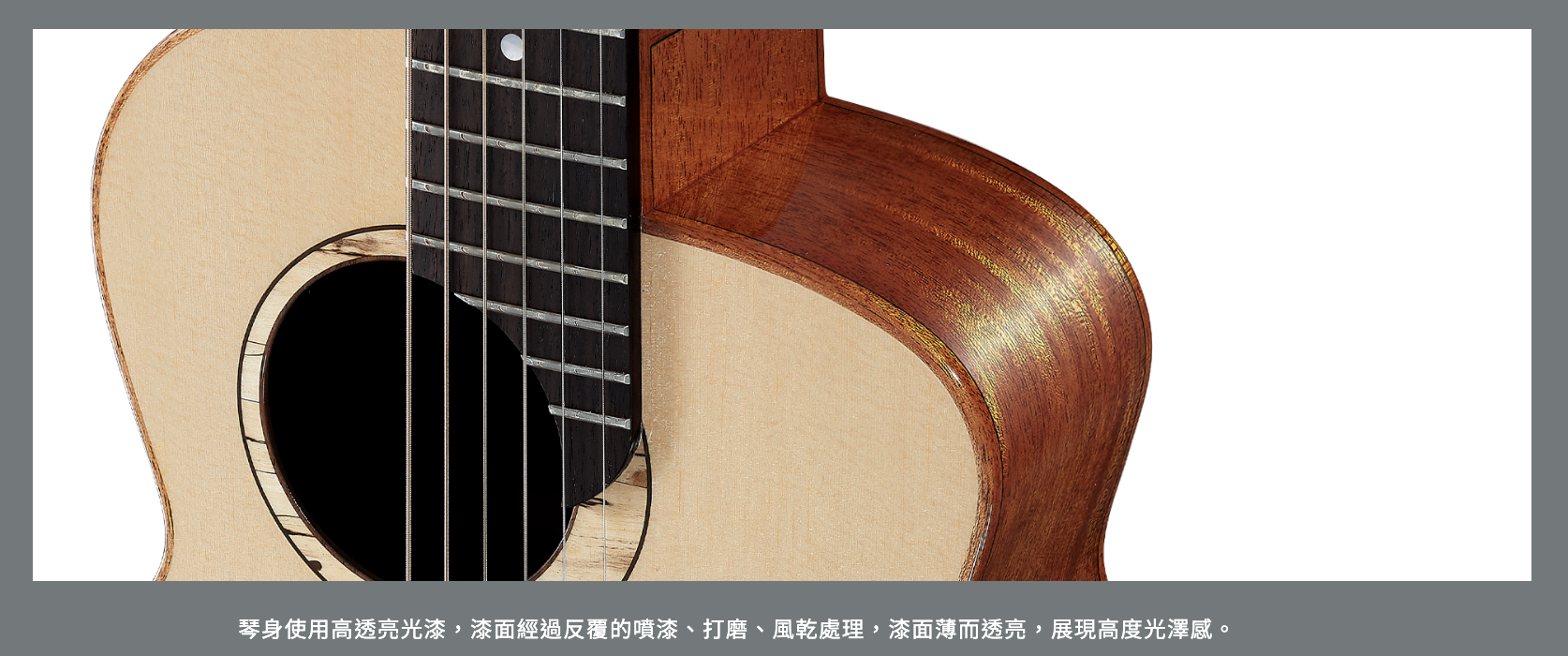 月亮雲杉音色明亮清脆、甜美細緻,有著圓潤又優雅的聲音特質。搭配傳導速度快、音色溫和的玫瑰木,不僅適合各種彈唱演奏也適合獨奏或是伴奏。