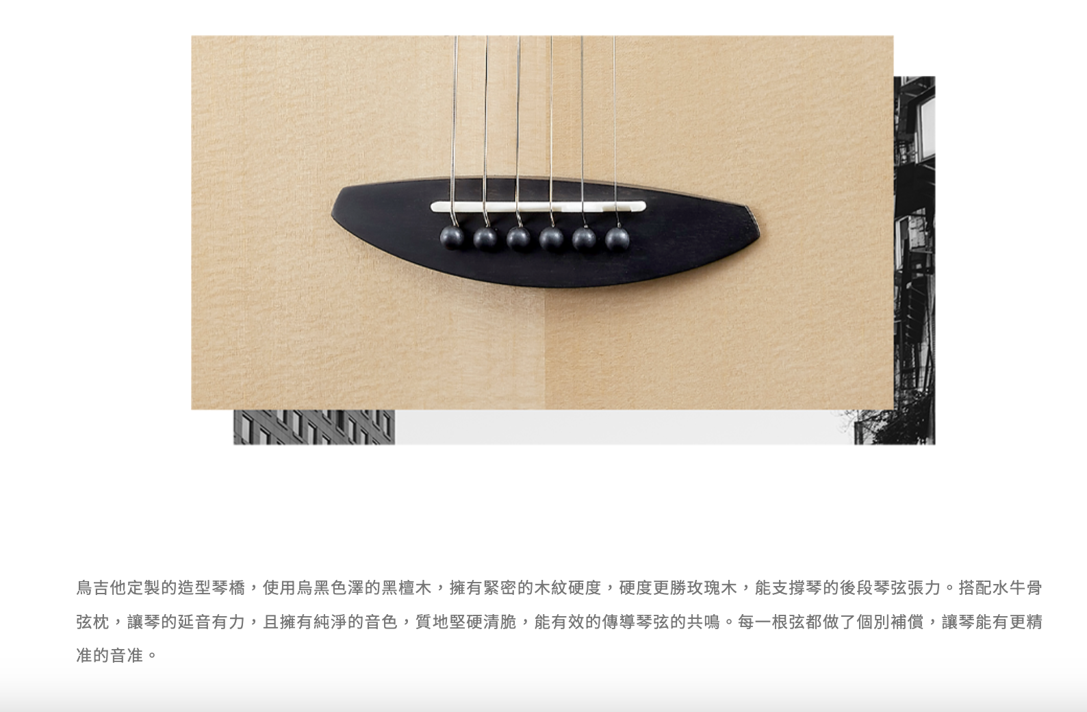 西加雲杉質量輕盈,非洲桃花心木穩定性優異,兩者聲音傳導皆快的特性,在低音、中音及高音的平衡上均有相當不錯的表現,適合各種彈唱與演奏。