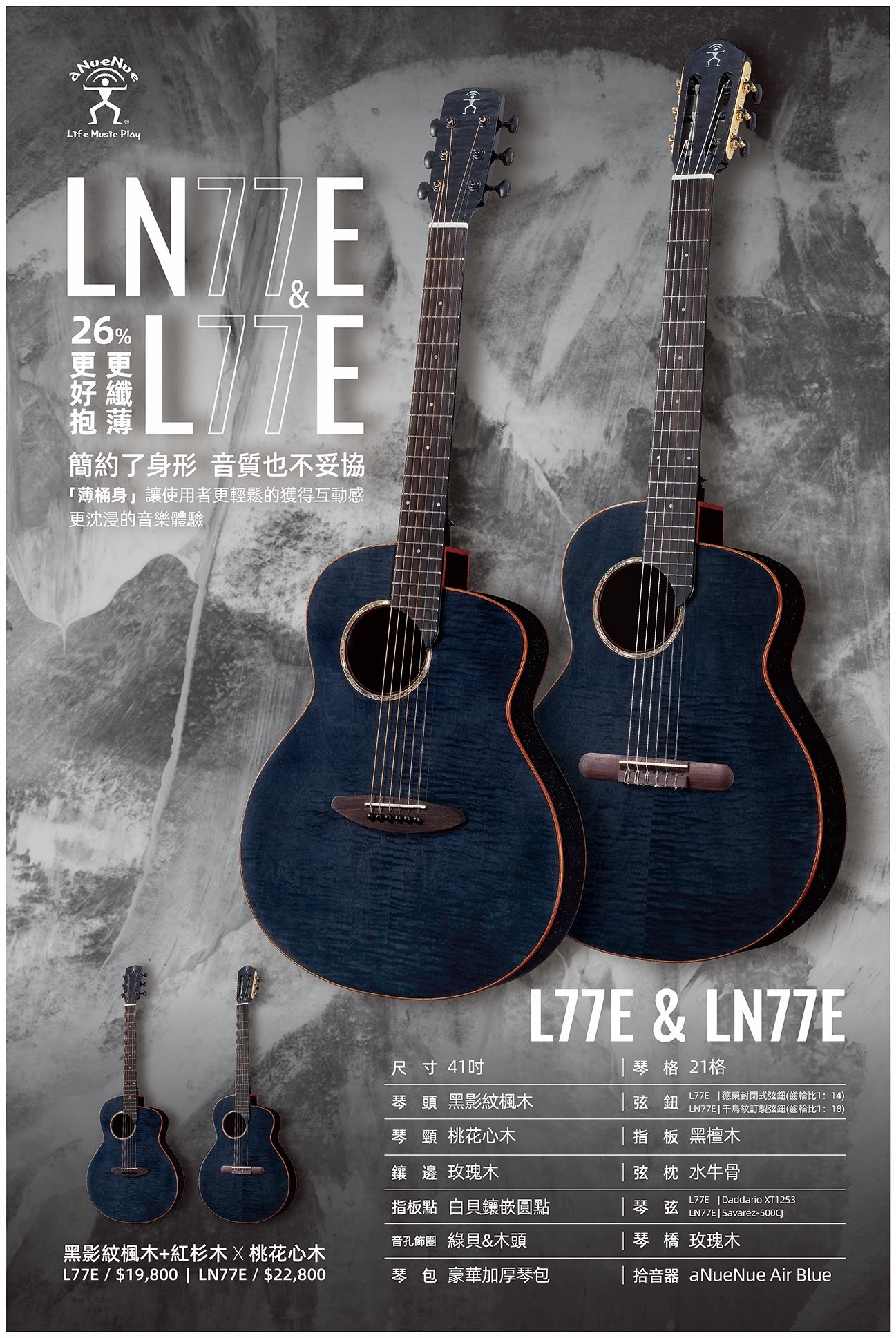2024 aNueNue最新款,L77E / LN77E,黑影紋楓木+紅衫雙重組合,搭配桃花心側背以及aNueNue原廠air blue拾音器,一把藝術品就這樣誕生了。輕薄桶身讓什麼身材高度的吉他愛好者都能夠輕鬆駕馭,趕快來親自體驗吧!