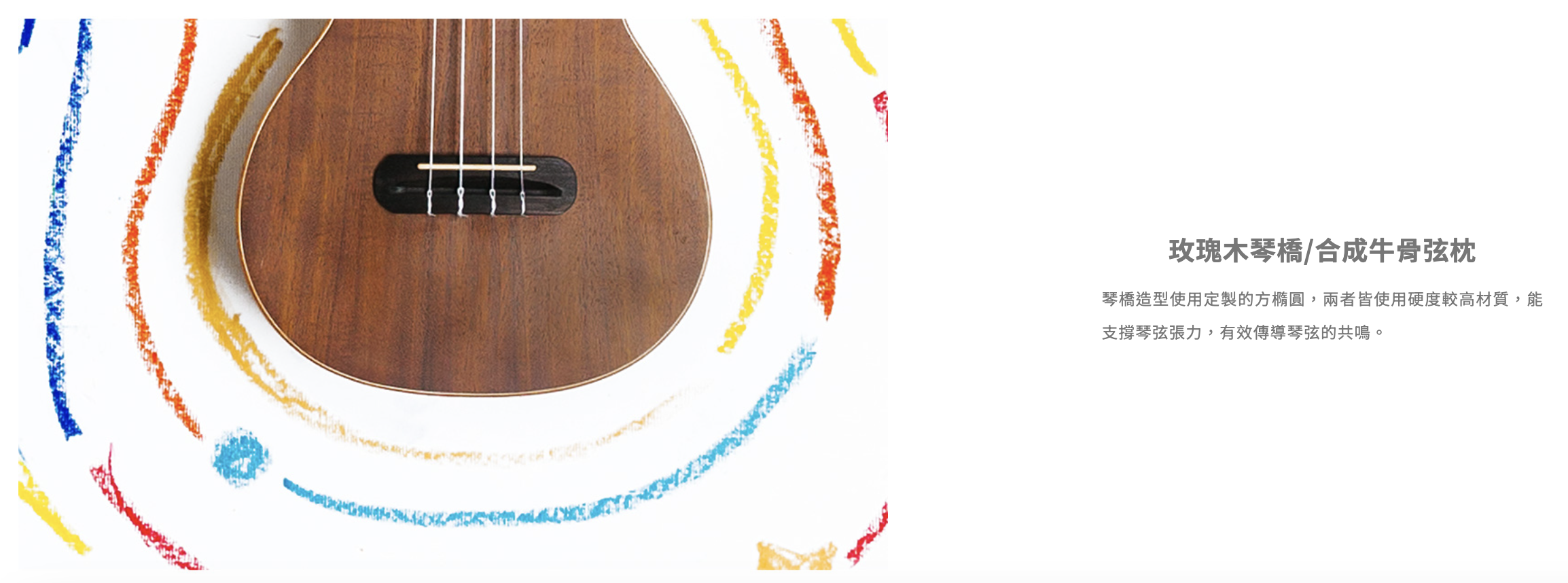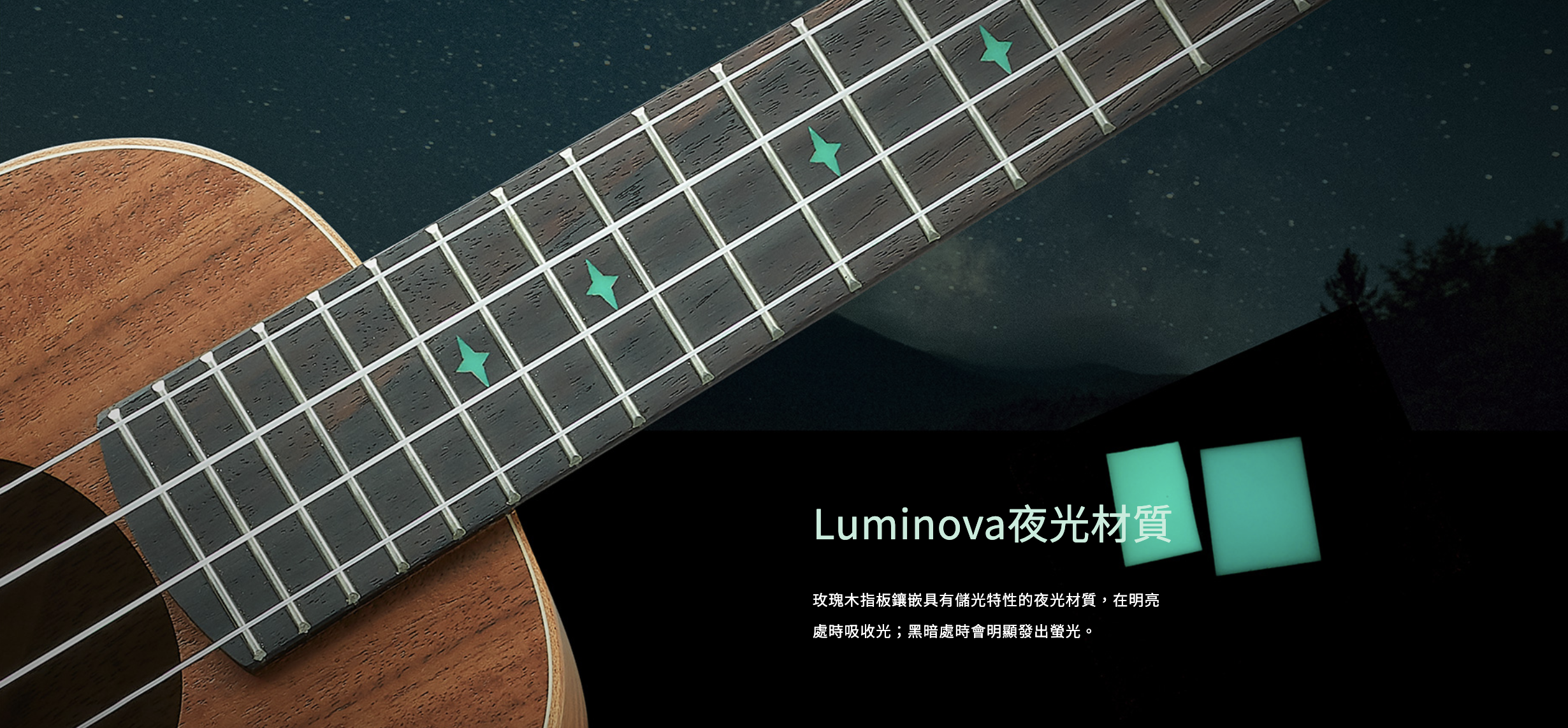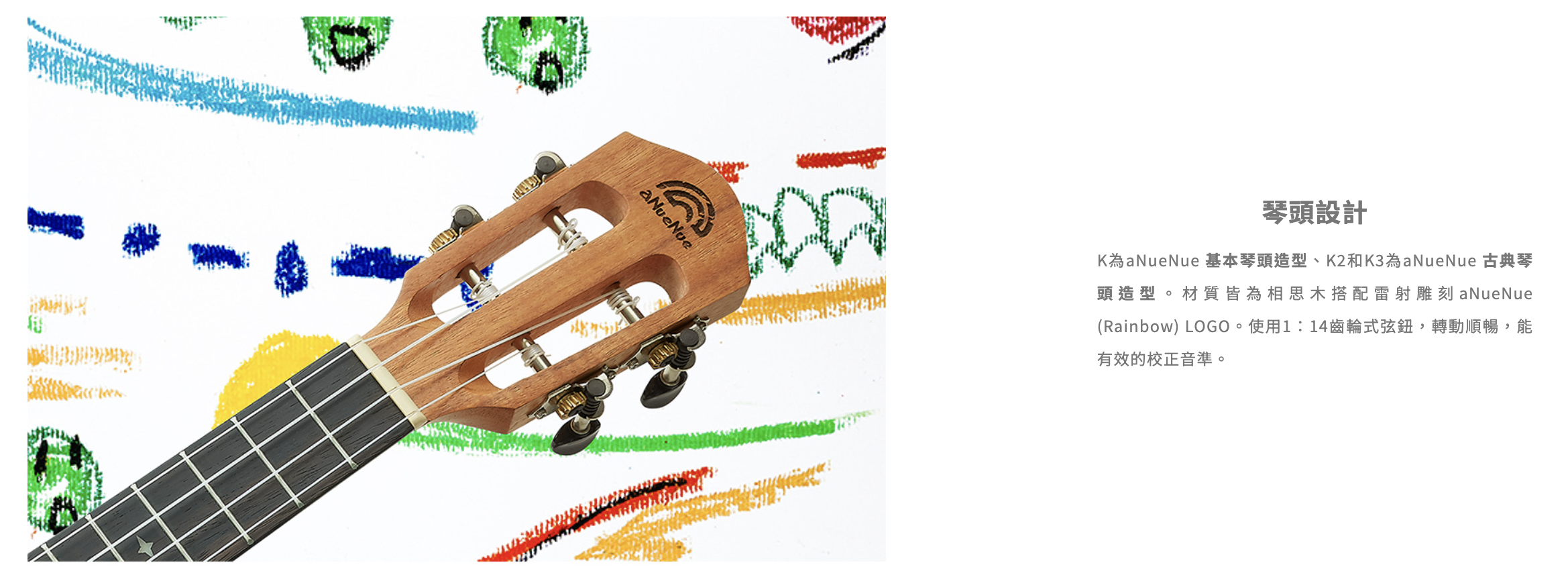aNueNue於2017推出的烏克麗麗副品牌“Rainbow小彩虹”,設計上結合特殊“Luminova夜光材質”,顯現活力;尺寸、材質上提供多種選擇,舒適手感與親民的價格,適合初學朋友入手。
