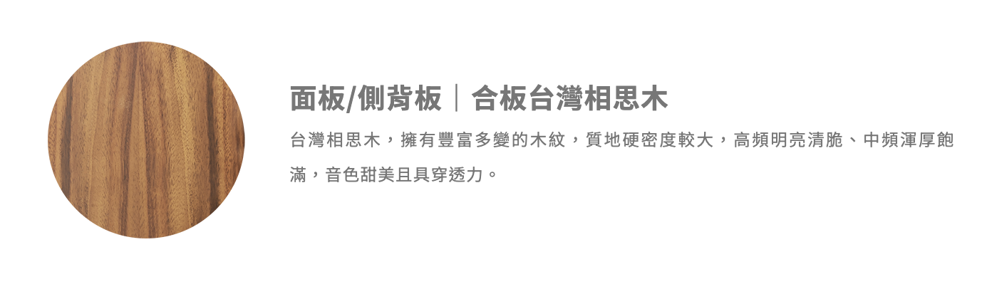 台灣相思木,擁有豐富多變的木紋,質地硬密度較大,高頻明亮清脆、中頻渾厚飽滿,音色甜美且具穿透力。