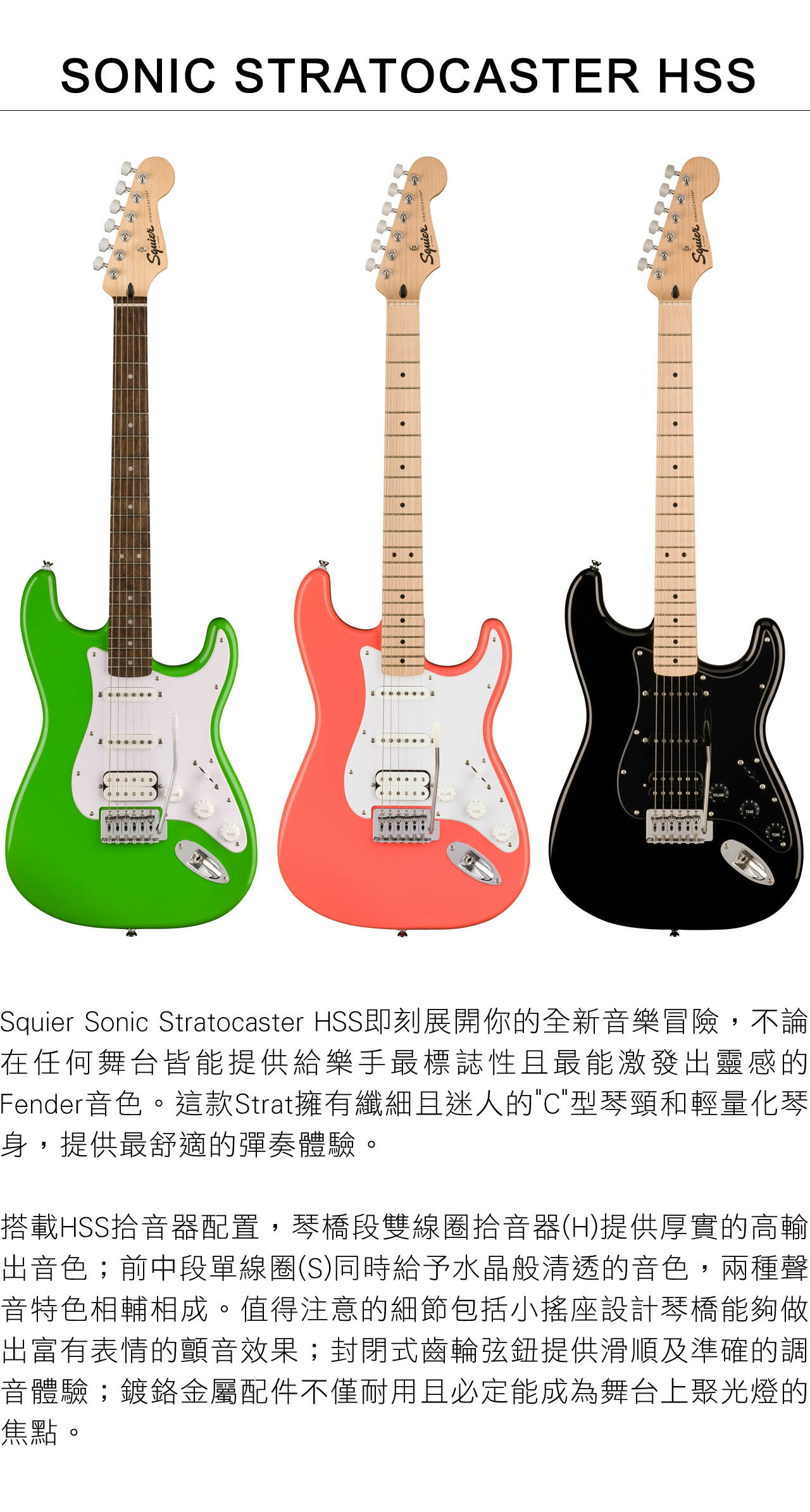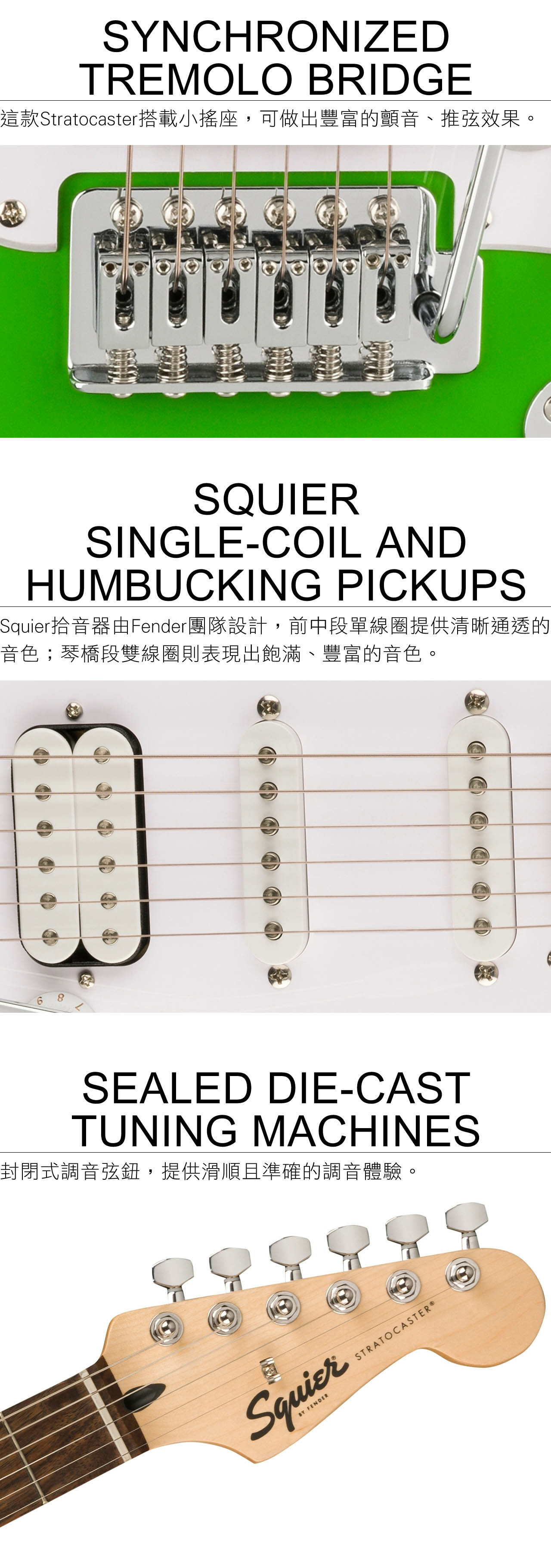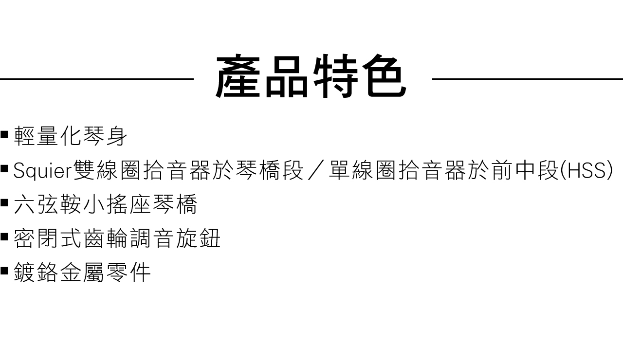 ● Squier琴橋段雙線圈拾音器、琴頸段單線圈拾音器和中段拾音器配置