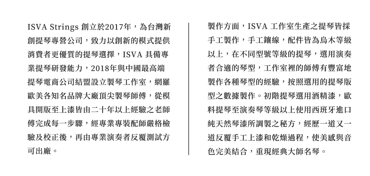 入門學習使用之型號,真正健康的手工提琴,非常適合初學及啟蒙階段使用,挑選實木材料,手工製作琴身(非機器夾板製作),西班牙式琴漆設計,搭配專業歐洲配件,聲音宏亮可幫助學習,且耐用度更佳!