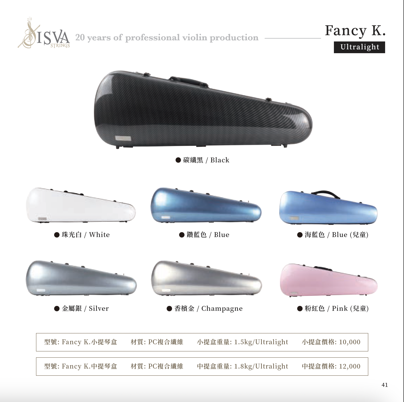 Fancy K.系列提琴盒,是ISVA品牌獨有設計的款式,為了符合亞洲人的身型,及演奏者攜帶便利性,特別選用成本較高的碳纖維材質,外殼表層耐刮,厚度輕薄設計,重量也僅1.3~1.5kg,除了兼具輕便性,防水性,保護性等優點,外觀也提供五款時尚色系,讓演奏者挑選最適合自己的琴盒。