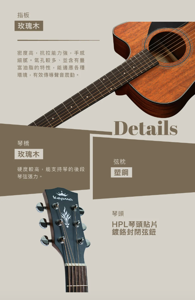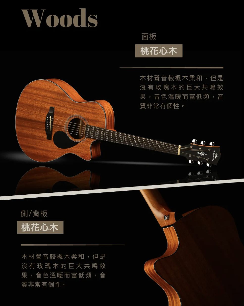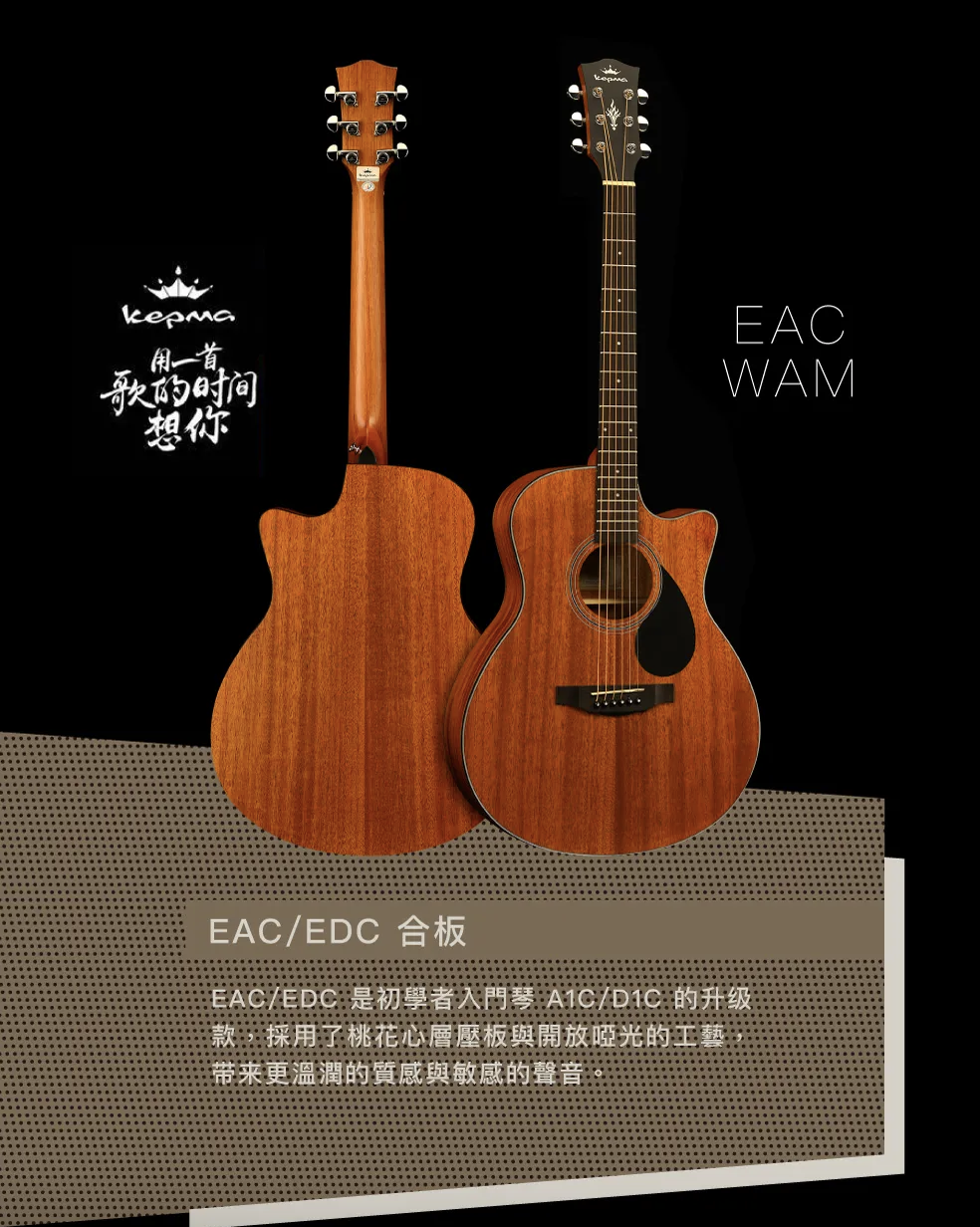 初學者入門琴EAC/EDC系列,嚴選的桃花心木搭配開放啞光漆的工藝,能帶來更溫潤細膩的聲音。而數控加工的導入,也讓初階款的此系列也能擁有舒適的彈奏手感。