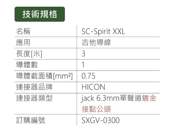 SC-Spirit XXL 吉他手的夢幻線材!這款線材是全球專業樂手的首選,被譽為樂器線材市場的終極標竿。憑藉特殊絞線技術、1×0.75mm2 超粗線芯與雙重屏蔽(碳纖維屏蔽層+銅隔離網),它在市場上幾乎沒有對手!不僅擁有極低的信號損耗,確保純淨無染的音色輸出,還具備優異的抗雜訊性能。