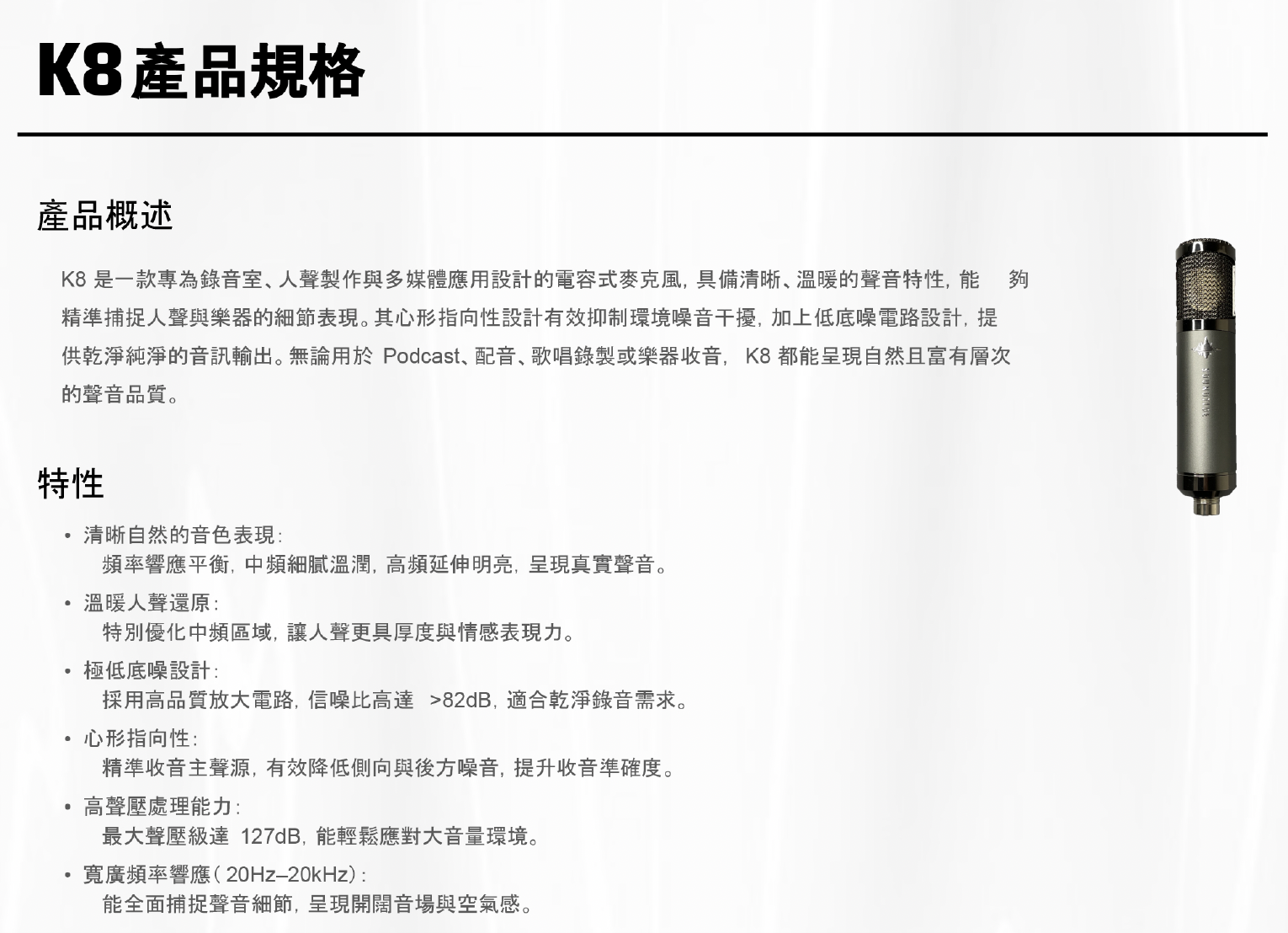 K8 是一款專為錄音室、人聲製作與多媒體應用設計的電容式麥克風,具備清晰、溫暖的聲音特性,能 夠精準捕捉人聲與樂器的細節表現。其心形指向性設計有效抑制環境噪音干擾,加上低底噪電路設計,提供乾淨純淨的音訊輸出。無論用於 Podcast、配音、歌唱錄製或樂器收音,K8 都能呈現自然且富有層次的聲音品質。