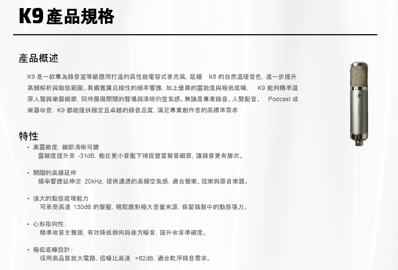 K9 是一款專為錄音室等級應用打造的高性能電容式麥克風,延續 K8 的自然溫暖音色,進一步提升高頻解析與動態範圍。具備寬廣且線性的頻率響應,加上優異的靈敏度與極低底噪,K9能夠精準還原人聲與樂器細節,同時展現開闊的聲場與清晰的空氣感。無論是專業錄音、人聲配音、Podcast 或樂器收音,K9都能提供穩定且卓越的錄音品質,滿足專業創作者的高標準需求