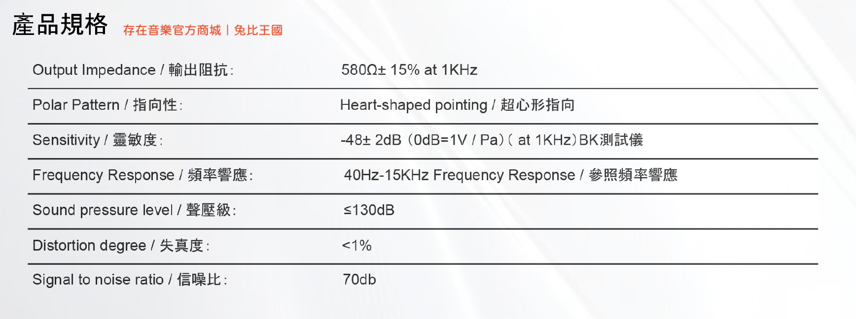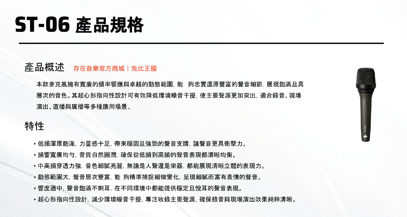 本款動圈麥克風擁有寬廣的頻率響應與卓越的動態範圍,能夠忠實還原豐富的聲音細節,展現飽滿且具層次的音色。
