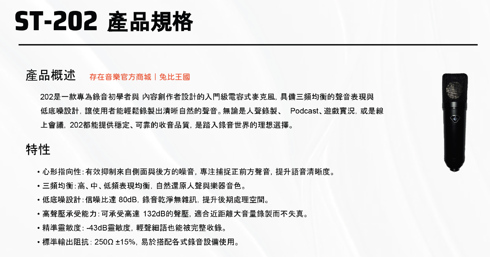 202是一款專為錄音初學者與內容創作者設計的入門級電容式麥克風,具備三頻均衡的聲音表現與低底噪設計,讓使用者能輕鬆錄製出清晰自然的聲音。無論是人聲錄製、Podcast、遊戲實況,或是線上會議,202都能提供穩定、可靠的收音品質,是踏入錄音世界的理想選擇。